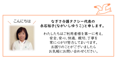なぎさ介護タクシーでは、お客様の日々の生活に 楽しみがプラスされるような、活力を生みだす原動力のお手伝いができればと考えております。 移送サービスやケアサービスを通して少しでも お役に立つことができれば嬉しいです。